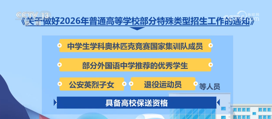 央視網(wǎng)消息:日前,教育部印發(fā)《通知》,部署做好2026年普通高校部分特殊類型招生工作。普通高校特殊類型招生主要包括藝術(shù)類專業(yè)招生、高水平運動隊招生、保送生、綜合評價招生4類。