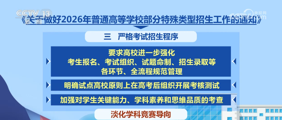 對于2026年普通高校部分特殊類型招生工作,《通知》要求,各地各有關(guān)高校建立有效監(jiān)督機制,暢通社會監(jiān)督渠道,及時公開公示有關(guān)信息,主動接受監(jiān)督。未按要求公示的考生一律不得錄取,牢牢守住公平公正底線。